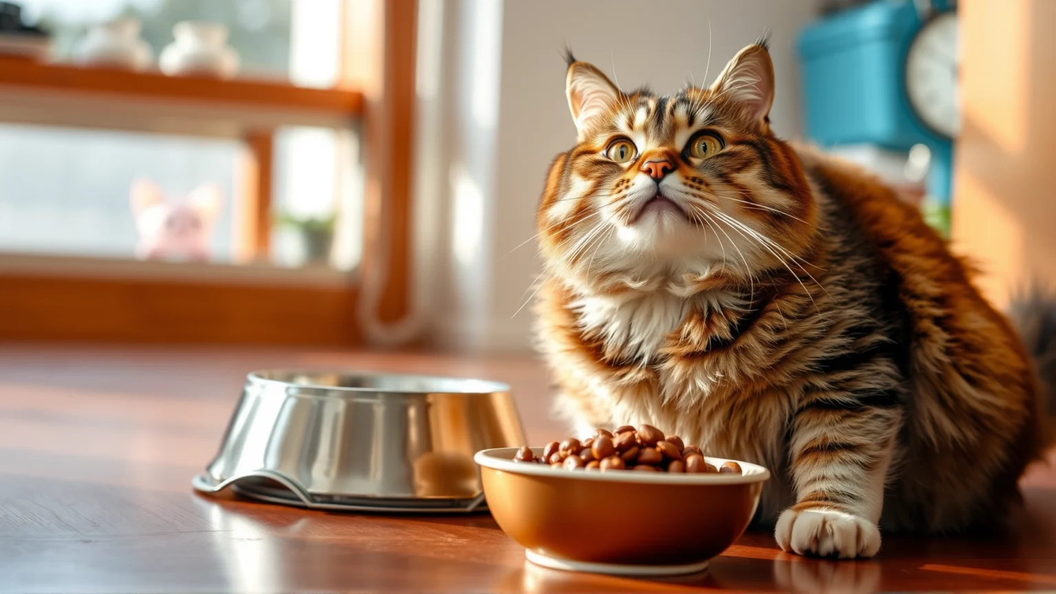 Close-up of a slightly overweight tabby cat sitting next to a food bowl, looking up with bright eyes, indoor natural lighting.