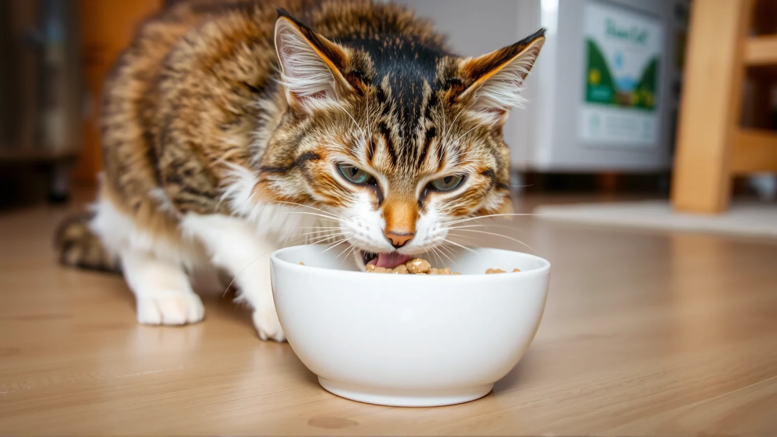 Cat licking wet food mixed with probiotic powder from a ceramic bowl on a kitchen floor, natural morning light, focus on the food and cat’s snout