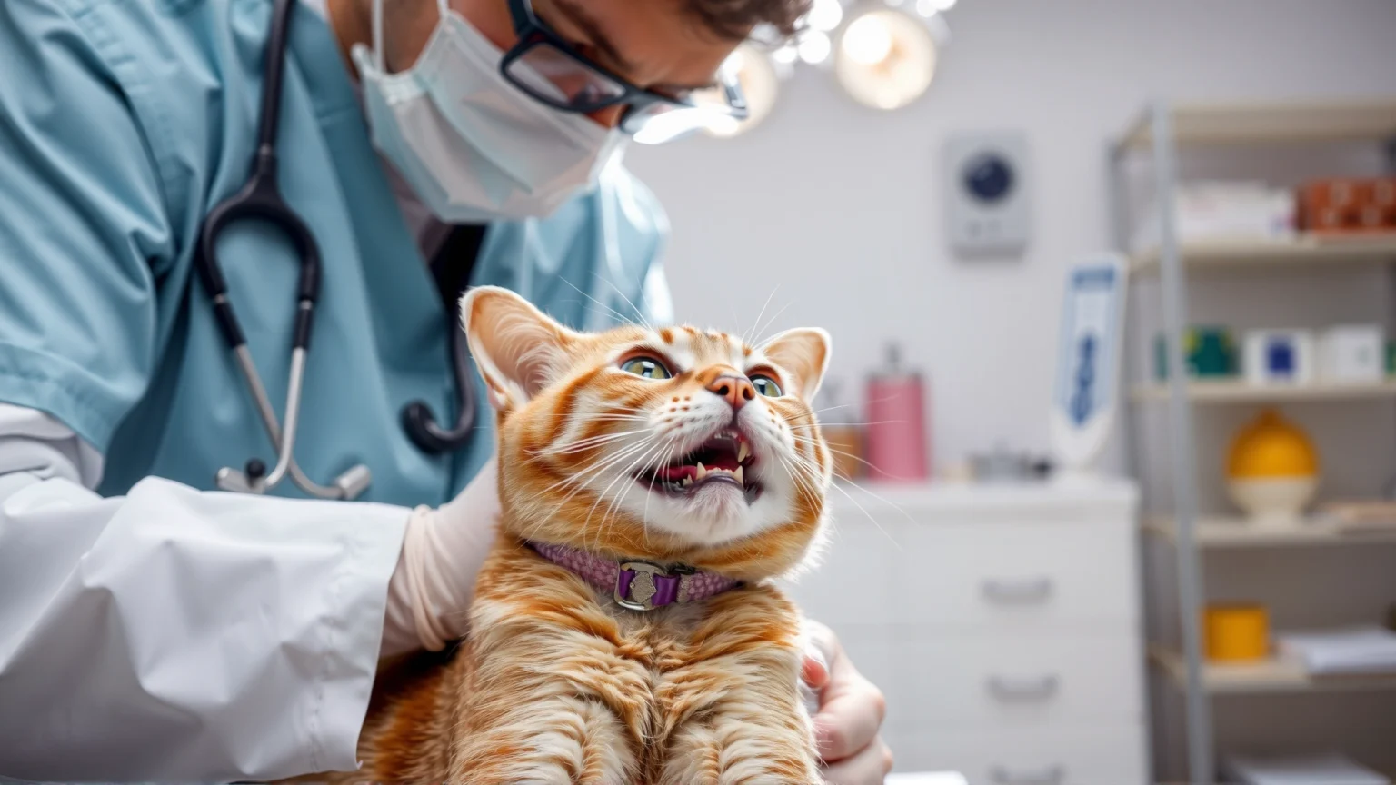 An attentive domestic short-haired cat looking up while a veterinarian gently supports its head, clinic background, shallow depth of field