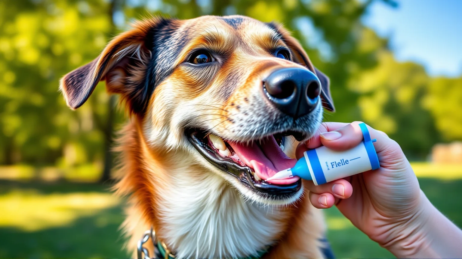Smiling dog owner applying the correct dose of topical flea medication to the back of their happy dog in a garden, bright colors, no text