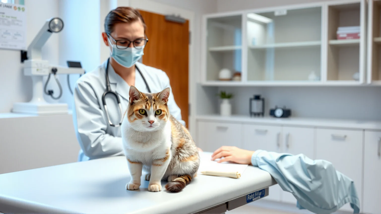 Veterinarian wearing gloves performing a gentle physical examination on a cat in clinic, with medical instruments blurred in background
