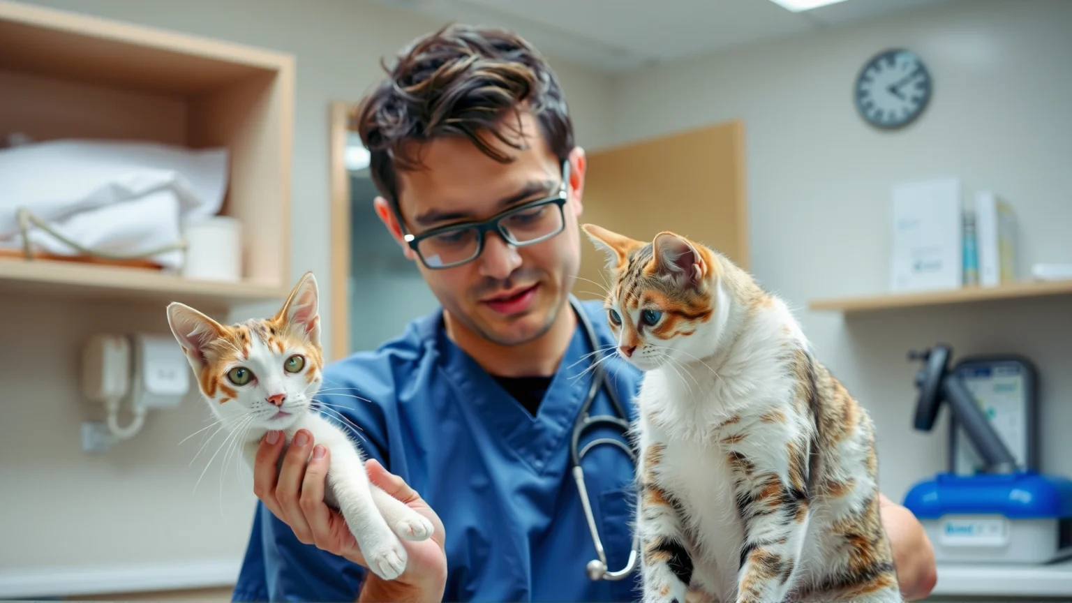 Veterinarian wearing a white lab coat gently examining a cat’s skin lesions in a well-lit veterinary clinic.