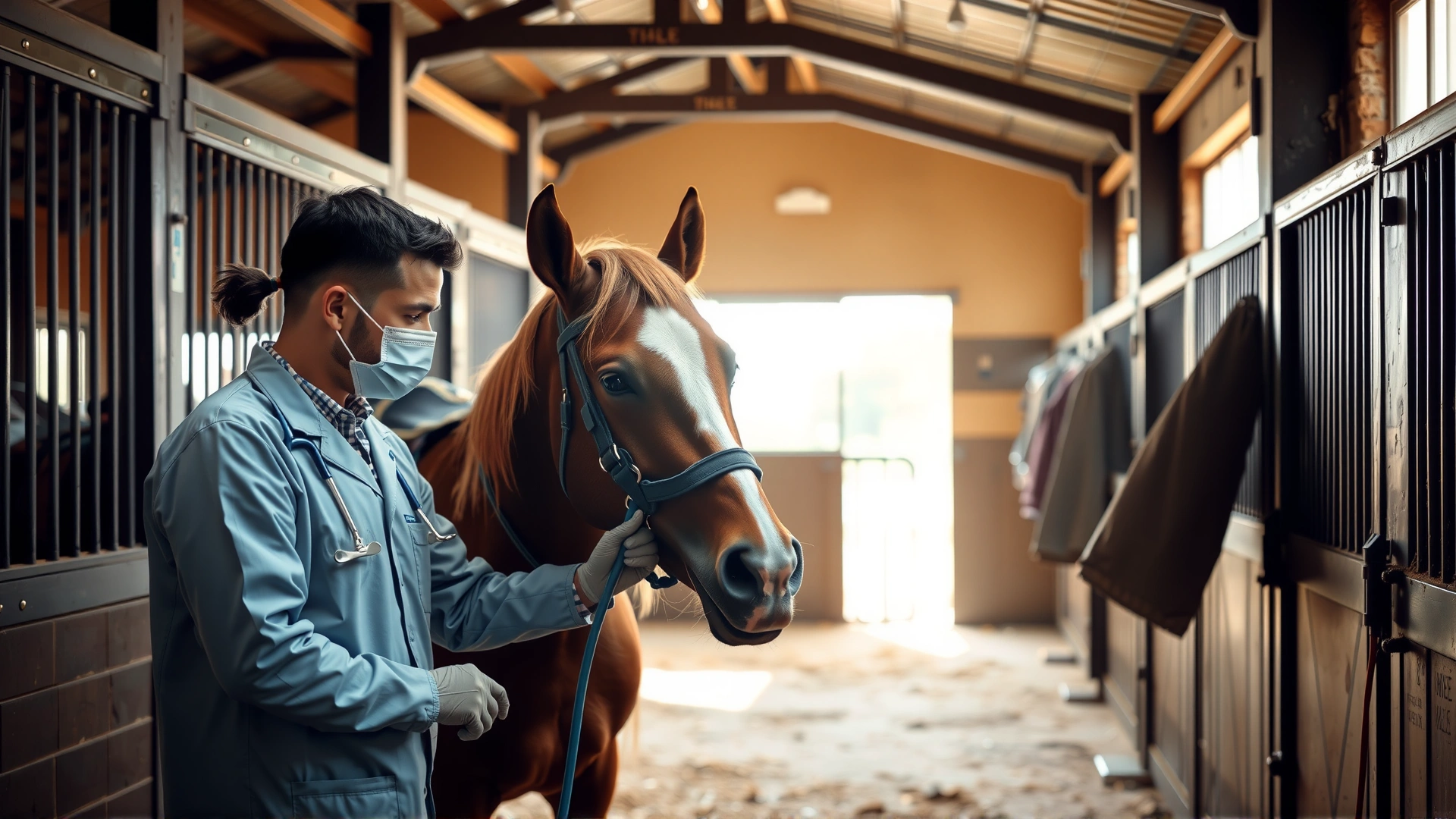 Close-up shot of a veterinarian holding a stethoscope to a horse's abdomen during a routine check-up, emphasizing the diagnostic process.