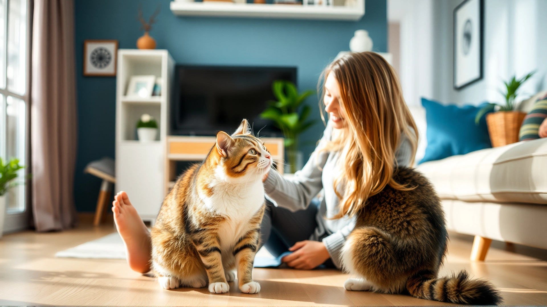 A woman gently petting her domestic short-haired cat on her lap in a bright living room, illustrating closeness and daily interaction.