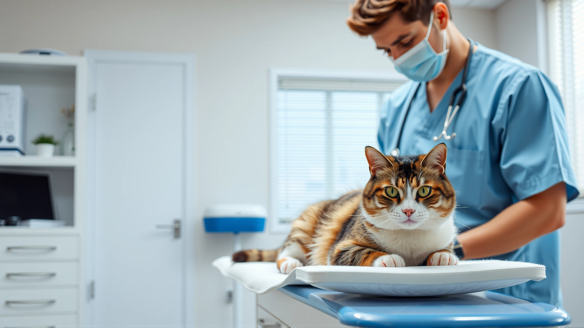 Veterinarian wearing scrubs and stethoscope gently examining a male cat on an examination table in a bright veterinary clinic