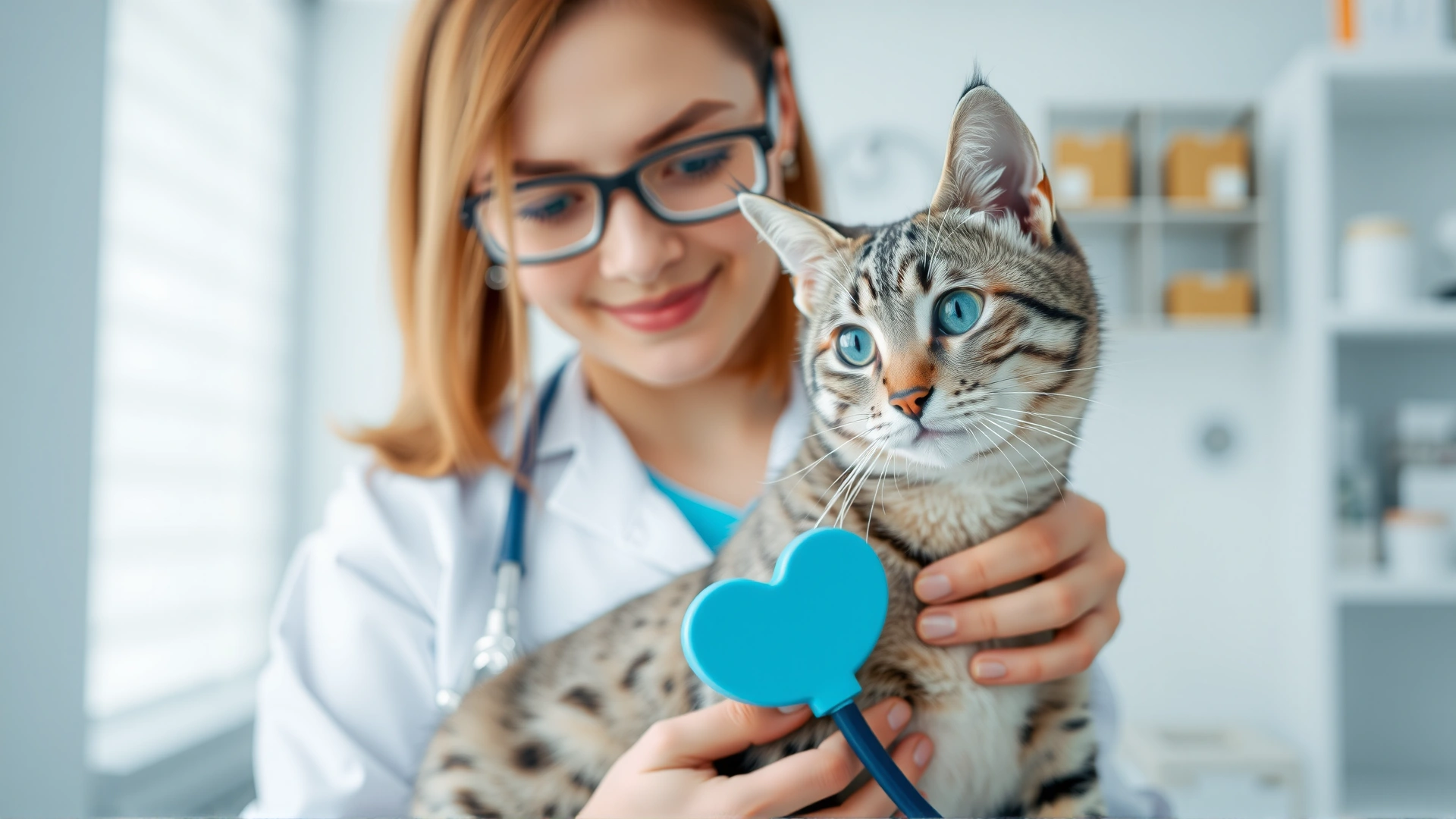 Close-up of a grey tabby cat calmly looking while a veterinarian wearing white coat places stethoscope on its chest, veterinary clinic background, bright lighting, high resolution