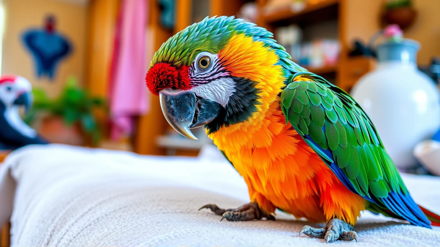 Veterinarian gently examining a small parakeet on a clinic table, medical equipment blurred in background, reassuring atmosphere