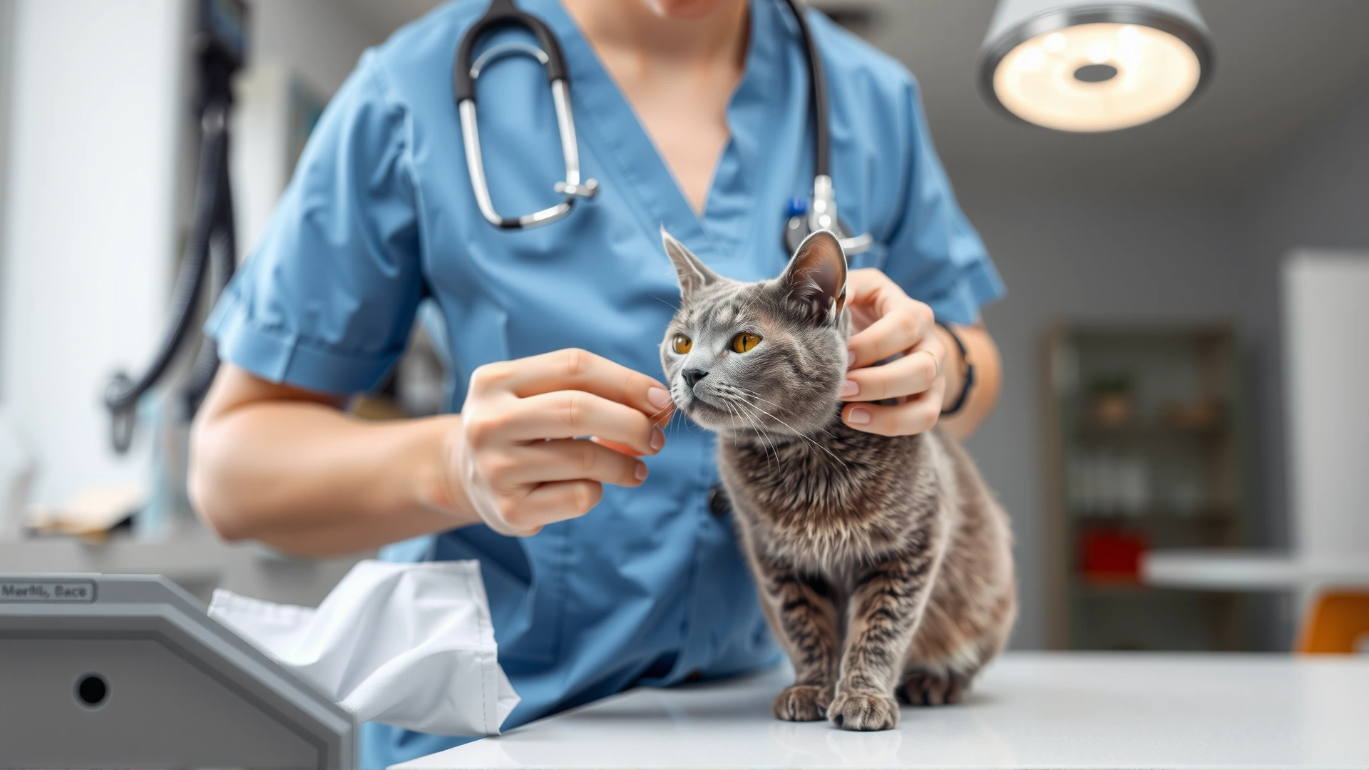 Veterinarian performing rhinoscopy on an anesthetized cat on an operating table with medical equipment visible.