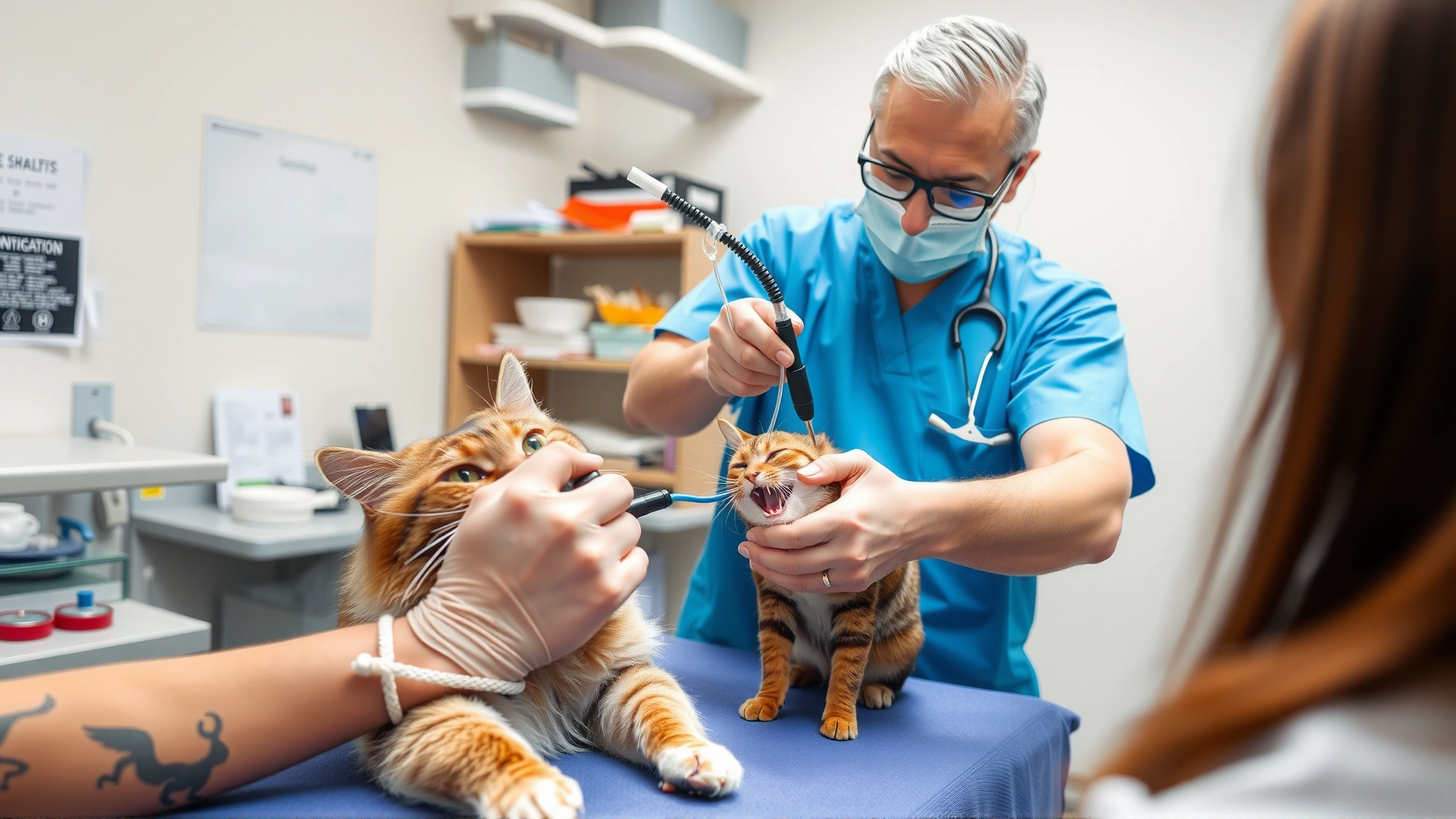 Veterinarian using a flexible endoscope to examine a sedated cat's nasal cavity in a modern veterinary clinic