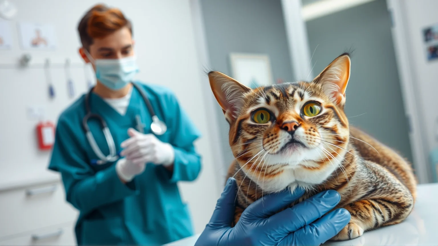 Veterinarian wearing white coat and stethoscope examining a tabby cat on clinic table