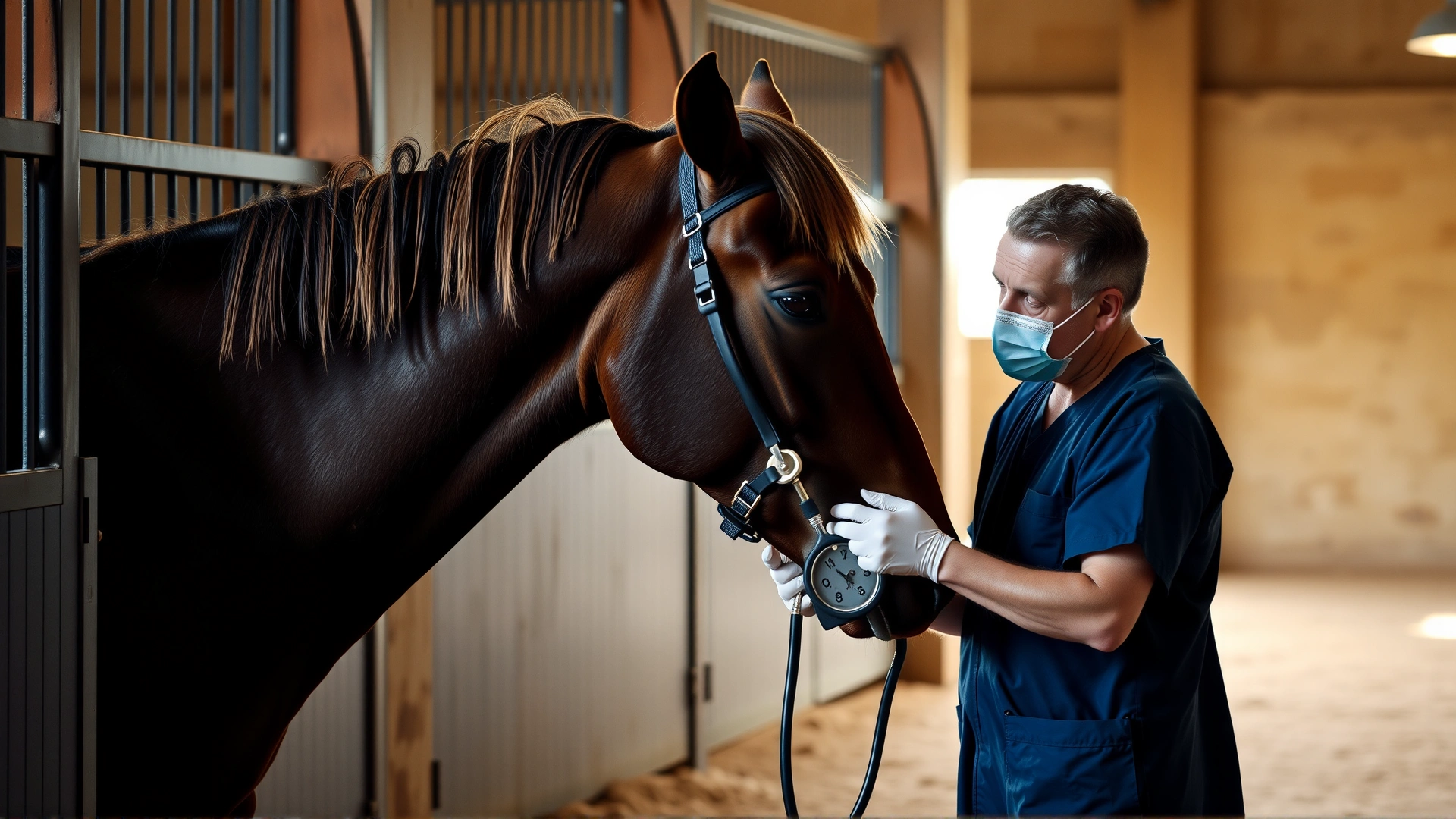Equine veterinarian in scrubs using a stethoscope on the chest of a calm bay horse inside a well-lit stable.