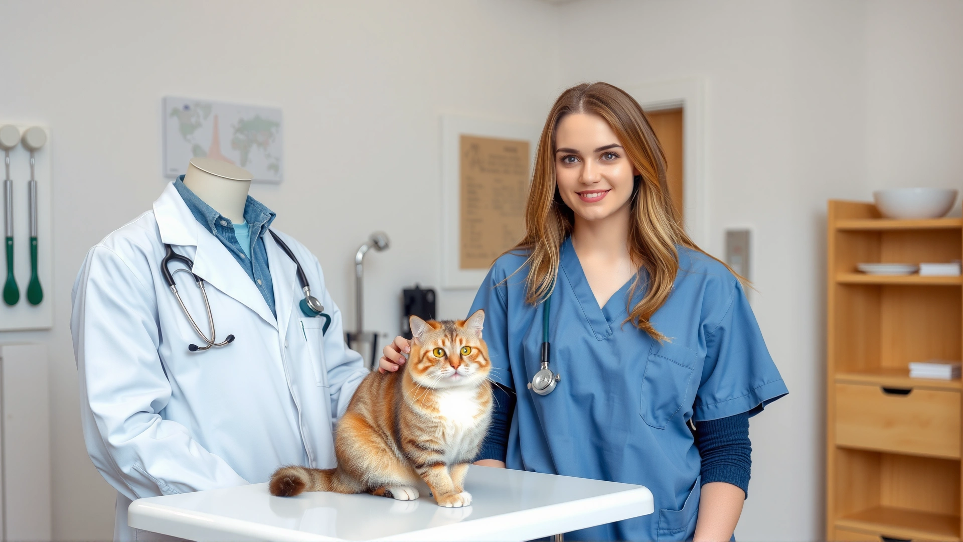 Veterinarian performing an echocardiogram on a calm cat using an ultrasound probe, modern veterinary clinic interior