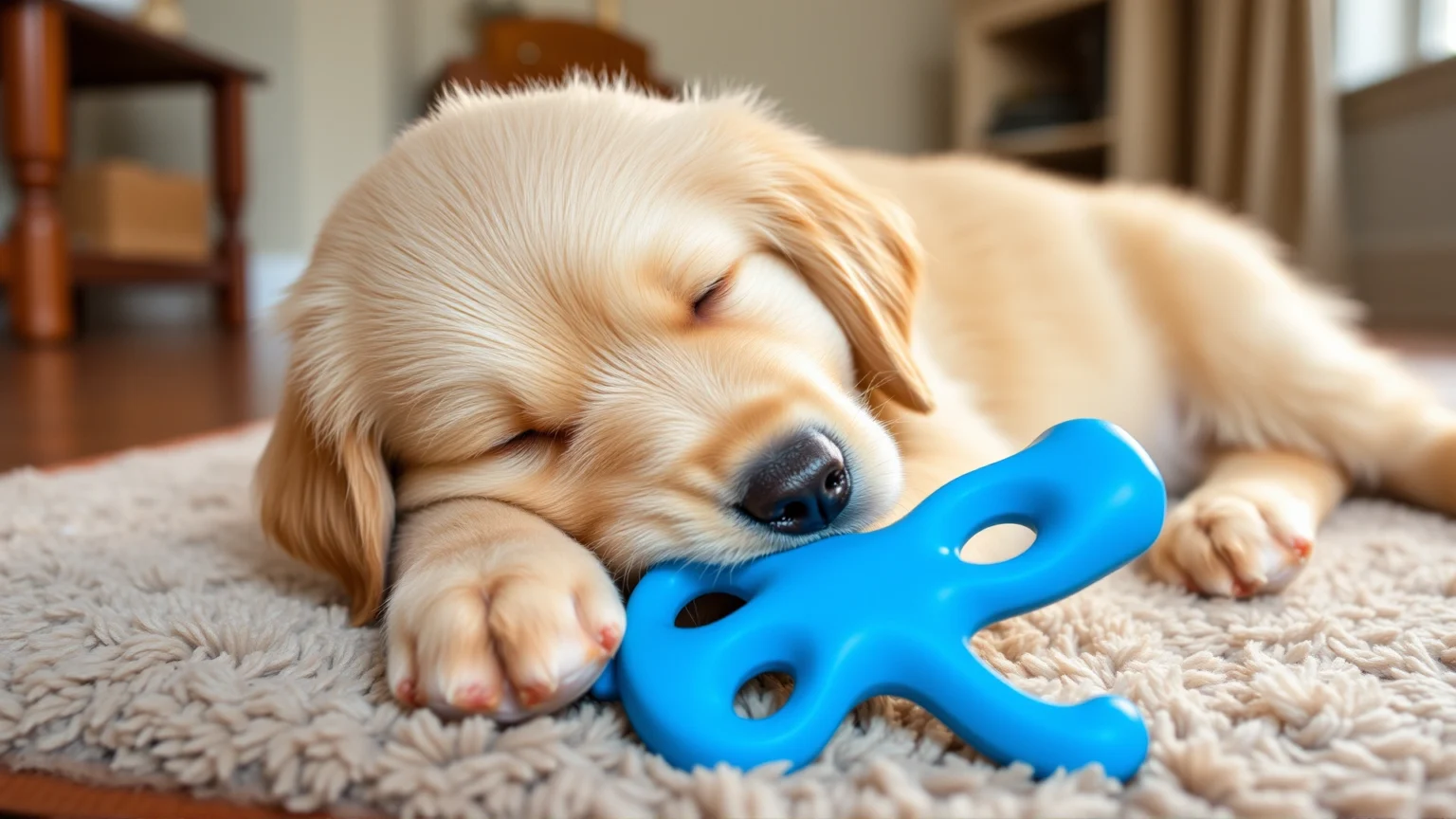 اختر ألعابًا مُصمَّمة خصيصًا للجراء، مصنوعة من مطاط ناعم ولكنه متين. تجنّب الألعاب القاسية جدًا التي قد تؤذي اللثة الحساسة.