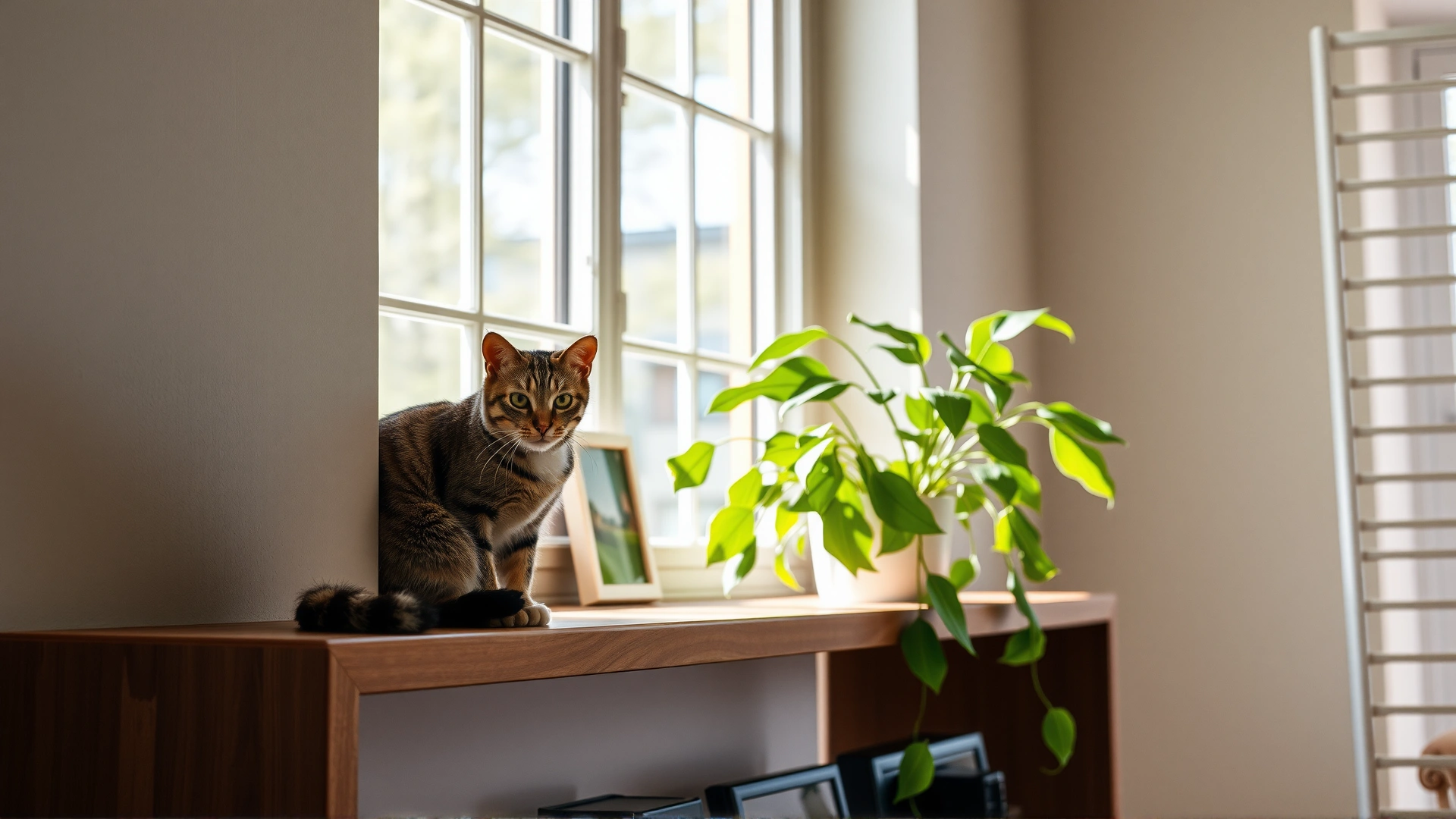 A sunlit modern apartment interior with a cat sitting on a wooden table surrounded by various lush green, cat-safe houseplants, giving an inviting overview feeling.