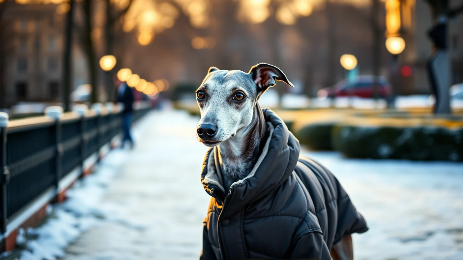 Graceful Greyhound running across a frosty field in a fitted fleece-lined coat; motion blur background.